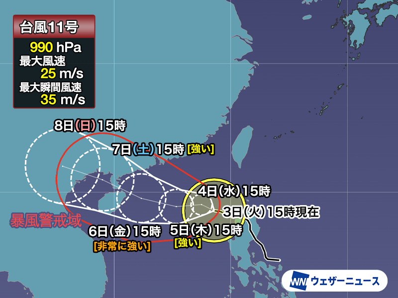 台風11号は南シナ海を西進しながら発達するとみられます。明日4日(水)には暴風域を伴い、6日(金)には中心付近の最大風速が50m/sに達して、非常に強い勢力となる見込みです。