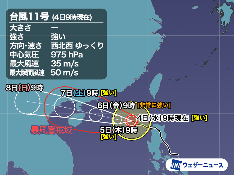 昨日の9時の時点では中心気圧が998hPa、最大風速20m/sだった台風11号は南シナ海に入ってから急速に発達しています。中心気圧は24時間で23hPa低下し、最大風速は35m/sに達しました。