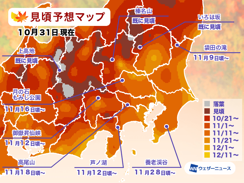 関東・甲信は9月下旬以降、度々秋の空気が流れ込み、関東北部や長野県の標高が高い山から色付きが始まりました。これまでの厳しい残暑の影響で、竜頭滝(栃木)や上高地・河童橋付近(長野)など、例年10月中旬にかけて見頃を迎える名所では、平年より遅めの見頃になったところが多い状況です。
