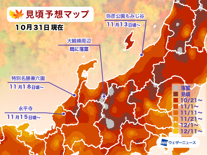 葉の色付きに関しては、大観峰周辺(富山)で鮮やかな紅葉となりました。今後も葉が鮮やかに色付くために必要な日差しと雨が見込めるため、多くの名所で鮮やかな紅葉が期待できそうです。