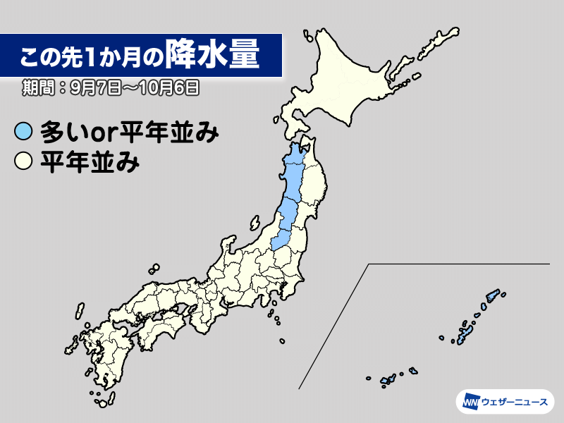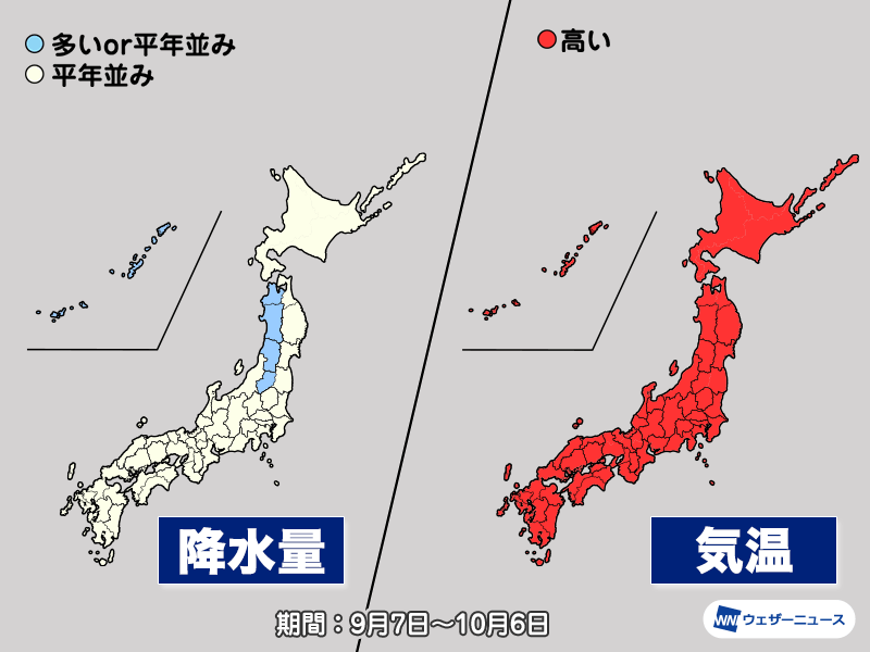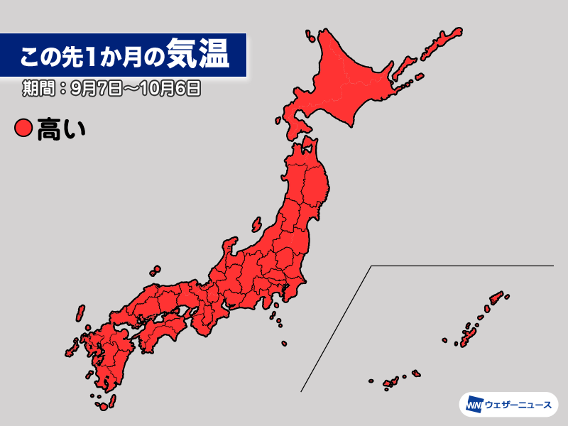 今日5日(木)、気象庁は9月7日から10月6日までの1か月予報を発表しました。太平洋高気圧の勢力は日本の南海上で強く、上空は暖かな空気に覆われ全国的に気温の高い状態が続きます。沖縄や奄美では台風などの熱帯擾乱の影響を受けやすい時期がある見込みです。