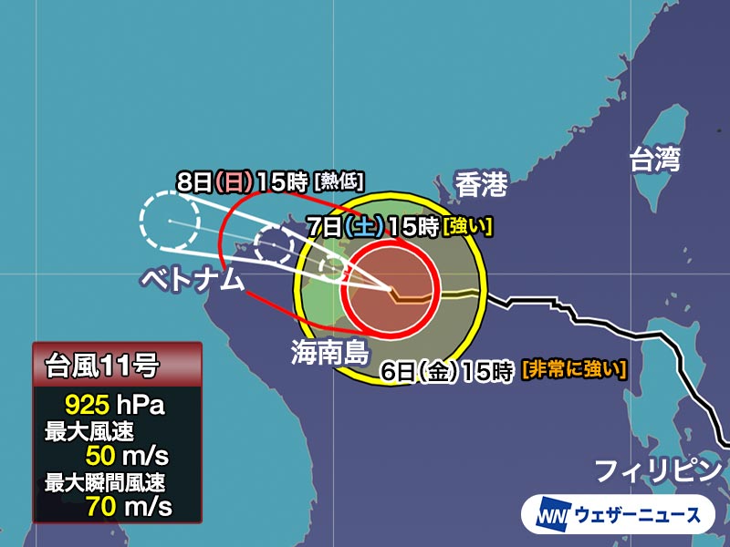 海南島や広東省の雷州半島には非常に強い勢力での直撃が予想され、暴風雨による甚大な被害が懸念されます。香港など南シナ海に近い地域でも風雨の強まるタイミングがある見込みです。