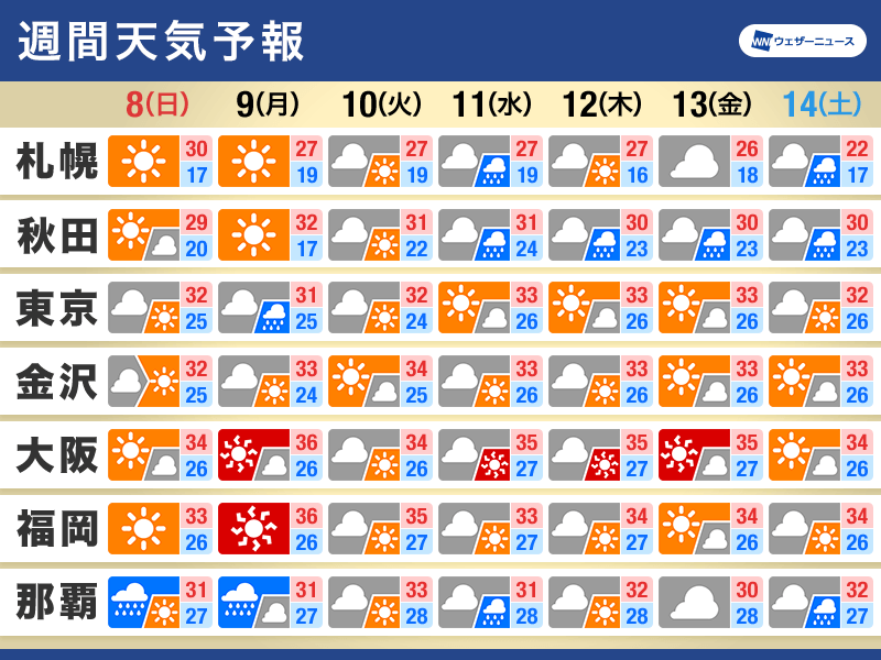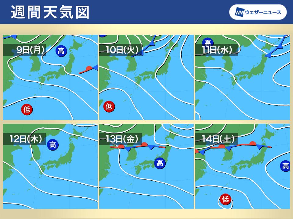 北日本を南下中の寒冷前線が停滞前線となり、週明け9日(月)にかけて東北地方〜東日本をゆっくりと南下する見通しです。