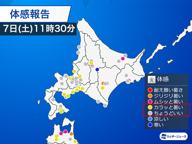 北海道は湿気の少ない秋の空気に包まれていて、ウェザーニュース会員から寄せられた体感報告でも黄色の「カラッと暑い」や灰色の「ちょうどいい」が見受けられます。