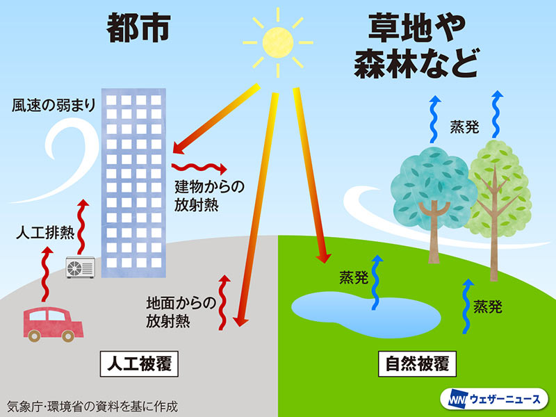 都市部では、地面がコンクリートで覆われることによる熱の吸収・放出の違い、雨の浸透・流出の差、ビル群による風の通り方の違い、車や建物からの排熱、緑地の有無による水蒸気の蒸発・発散の違い、日陰の多少…などが気温に影響を与えます。ヒートアイランド現象とも呼ばれ、都市化の影響は無視できません。