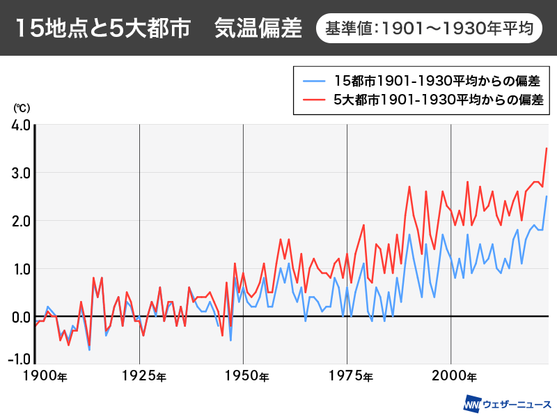 1901年から1930年の30年間の平均気温を0として、そこからの差を「日本の平均気温」と5大都市(札幌・東京・名古屋・大阪・福岡)で比較すると、5大都市の方が「日本の平均気温」に比べて気温上昇が顕著になっているのがわかります。都市部では、地球温暖化の影響と都市化の影響をダブルパンチで受けているといえます。