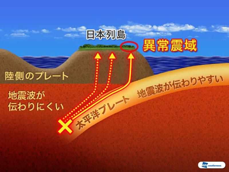 今回の地震は深く沈み込んだ太平洋プレートで発生したとみられます。震源よりも東側にある、太平洋プレートと陸側のプレートが接する日本海溝/伊豆・小笠原海溝の方向に揺れが伝わり、北日本や東日本の太平洋沿岸で揺れが強く現れたかたちです。