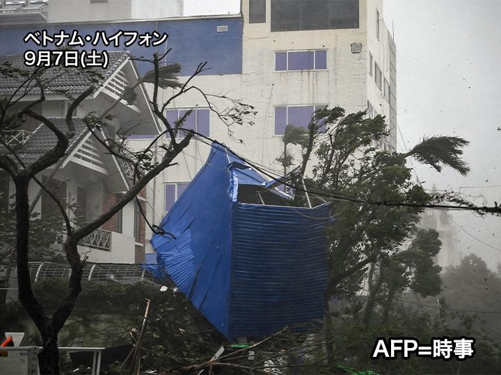 台風11号は6日(金)の夕方に中心気圧925hPaの非常に強い勢力で中国・海南島に上陸しました。その後はトンキン湾に進んで勢力を維持し、7日(土)の午後には中心気圧935hPa、非常に強い勢力のままベトナムに上陸しています。
