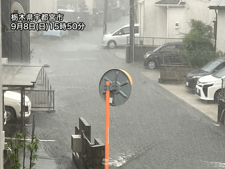 秋雨前線の南下に伴い、雨雲が発達しやすいエリアも少しずつ南に移ってきました。最も発達した雨雲が宇都宮市付近を通過し、16時までの1時間には46.5mmの激しい雨を観測。大雨警報が発表されています。