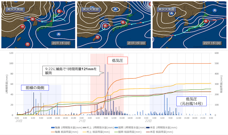 20日は「秋雨前線の南側」で秋田県・山形県・新潟県で、21日は秋雨前線上を進んだ「低気圧」によって石川県を中心に、22日は「台風14号から変わった温帯低気圧」で再度石川県を中心に強雨となりました。特に21日午前中は石川県輪島で1時間降水量、積算雨量いずれも上昇度合が顕著で、21日9:22に1時間雨量121mmを観測しています(※上記グラフは毎正時(分・秒の端数のつかない時刻))。