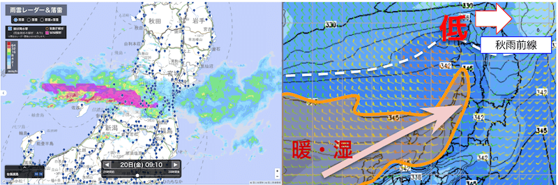 天気図上では青森付近を低気圧がこのタイミングで東進しました。ただし、気象レーダーを確認すると、低気圧や秋雨前線からやや南に離れた秋田~新潟付近で帯状の強い雨のエリアが広がっていることが特徴的です。これは右上図の水蒸気図を参考にすると、前線や低気圧の南側で、主たる湿った暖かな空気が流れ込んだ橙色域エリアと概ね合っていることがわかります。