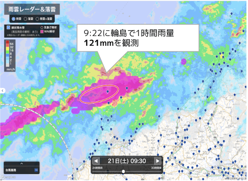 21日(土)は、アメダス輪島で1時間雨量100mm以上、24時間雨量で350mm以上を観測し、いずれも観測史上1位の記録となりました。10時50分には、金沢地方気象台は石川県(輪島市,珠洲市,能登町)に特別警報を発表。能登地方では、河川の氾濫、土砂災害、道路の冠水など、甚大な被害が発生しました。