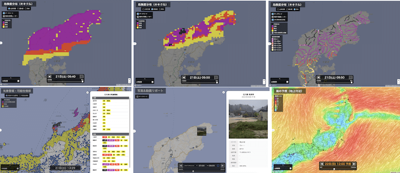21日(土)の朝時点の情報では能登半島北部を中心に土砂災害、浸水害、洪水ともに危険度が高いことが把握できていました。