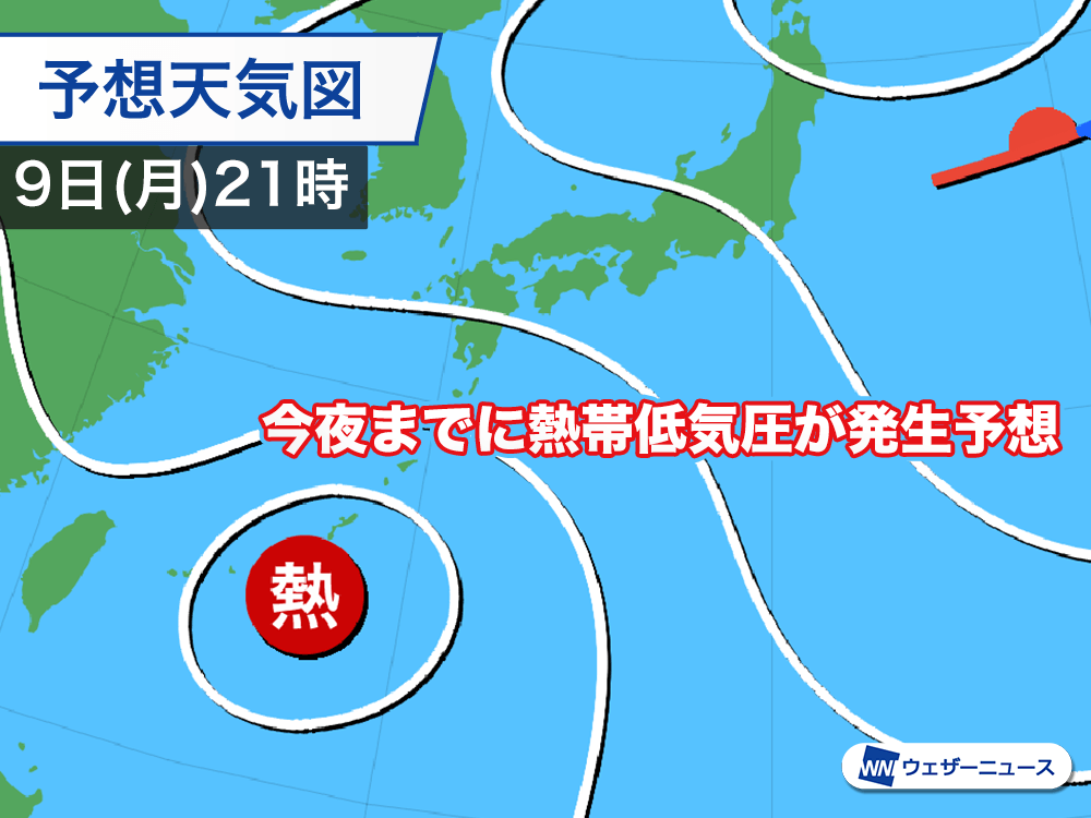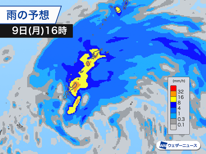 今日9日(月)の沖縄は奄美は、低圧部周辺の雨雲が通過し、朝から断続的に雨が降っています。今夜までに低圧部が熱帯低気圧に変わり、明日10日(火)にかけて沖縄近海を西北西に進む見込みです。