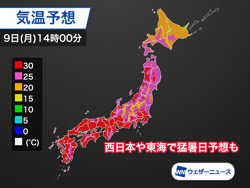 今日9日(月)も西日本を中心に、昨日と同じような残暑となっています。11時30分までの最高気温は、東京33.7℃、名古屋34.1℃、大阪34.4℃、福岡33.6℃です。