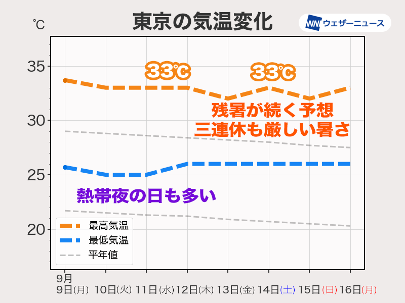 最低気温が25℃以上の熱帯夜となることも多く、一日を通して涼しさはありません。この先も屋外で活動は熱中症になりやすいので、こまめに日陰や涼しいところで休憩をしたり、適切に水分・塩分補給を行うなど、しっかりと対策を行ってください。
