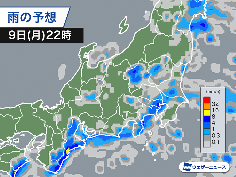 今日9日(月)の関東は、午後になって南部を中心に雨雲が発生しています。