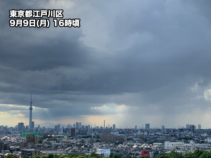 今日9日(月)の関東は、前線に向かって南から湿った空気が流れ込み、大気の不安定な状態が続いています。