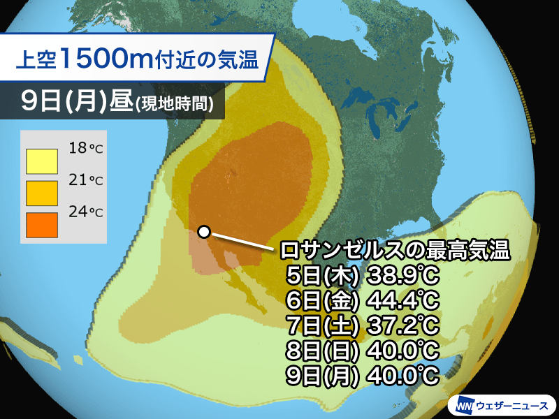 アメリカ西海岸は南から暖かな空気が流れ込みやすくなっています。上空1500m付近で+24℃以上の真夏のピークに匹敵するほどの暖気で、ロサンゼルスなどカリフォルニア州は9月とは思えないような暑さです。