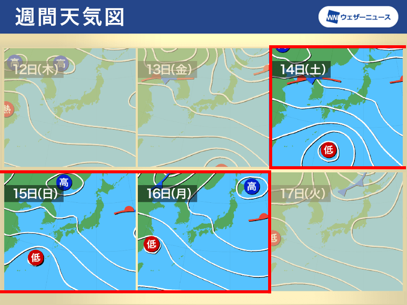 また、南からは湿った空気の流れ込みやすい状況が続きます。高知県や宮崎県など西日本太平洋側や、関東北部など内陸山沿いを中心に雨雲の発達に注意が必要です。東京都心など関東南部も、特に14日(土)は平野部を含めて雷雨の可能性があります。