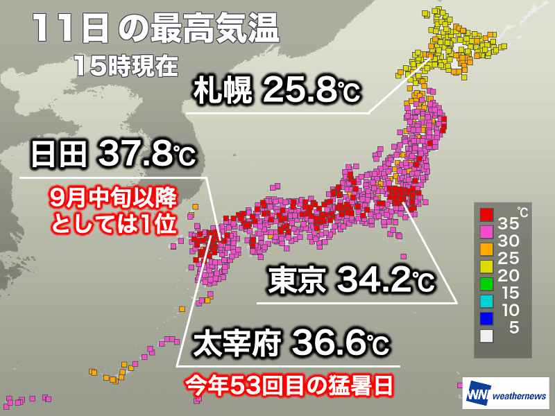 また、福岡県太宰府市は今日も35℃を超え、今年53回目の猛暑日となりました。昨日に続き、年間猛暑日日数の日本記録を更新しています。