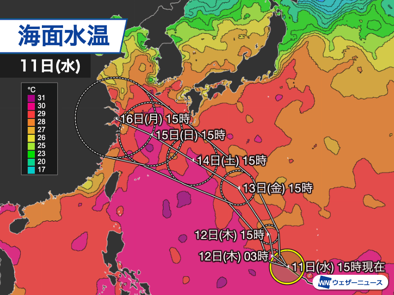 本州付近には太平洋高気圧が強く張り出すため、直接北上してくる可能性は小さくなっていますが、西日本太平洋側では周辺の湿った空気の影響で雨が降りやすくなります。また、東シナ海に進んだあとの進路はまだ不確実な部分があるため、影響がないとは言い切れません。こちらも今後の情報に注意してください。