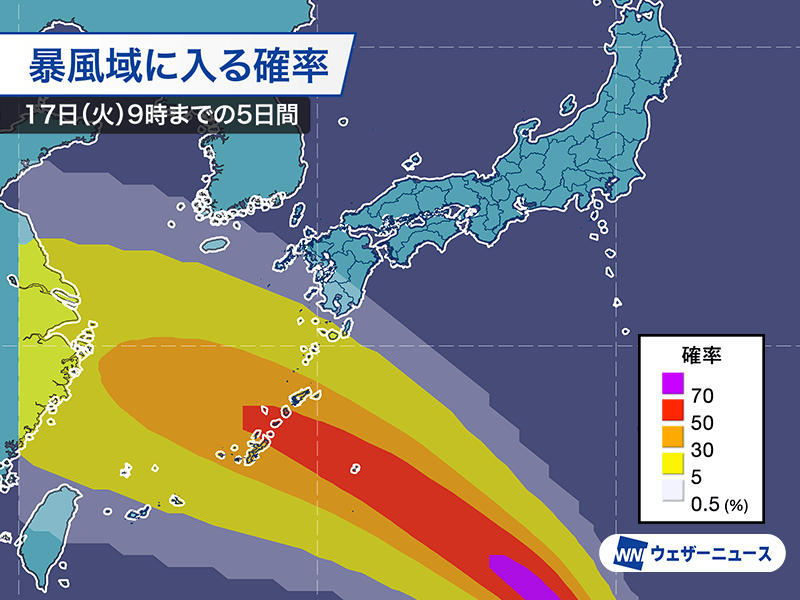 5日先までに台風の暴風域に入る確率が3%以上の府県予報区は以下の通りです。(気象庁)