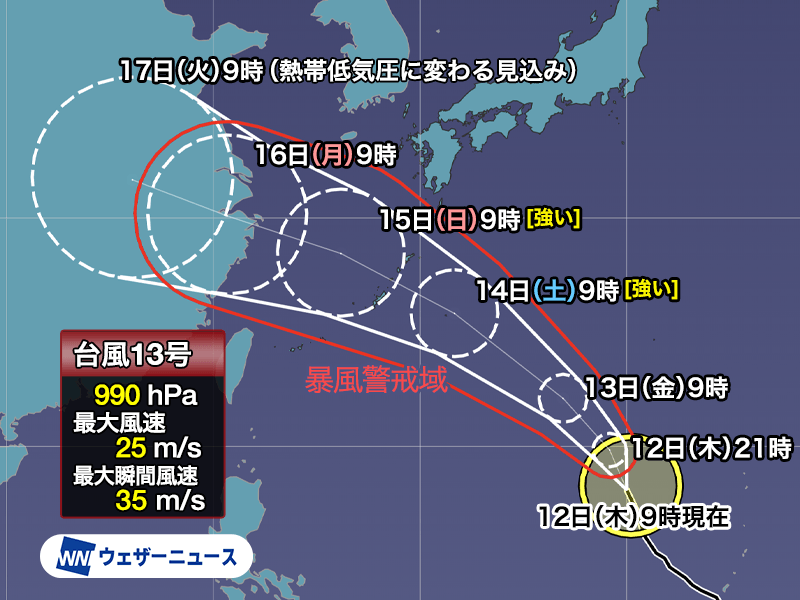 台風13号は日本の南を北西に進んで、14日(土)から15日(日)にかけて沖縄付近を通過し、東シナ海に進む可能性が高くなっています。