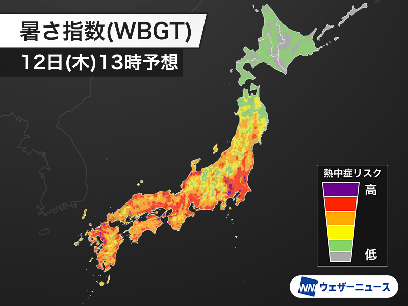 13時の暑さ指数(WBGT)予想では西日本から関東で熱中症の危険度が高い赤色の領域が広く、九州北部や近畿、東海、関東などには最も危険度が高い紫色の領域もみられます。