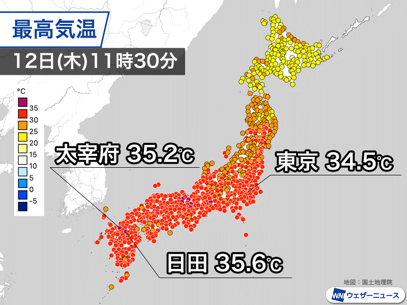 11時30分までの最高気温は、全国で最も上昇している大分県日田市で35.6℃を観測。福岡県太宰府市は35.2℃で、日本歴代最多をさらに更新する今年54日目の猛暑日です。東京都心も34.5℃と昨日を上回ってきました。