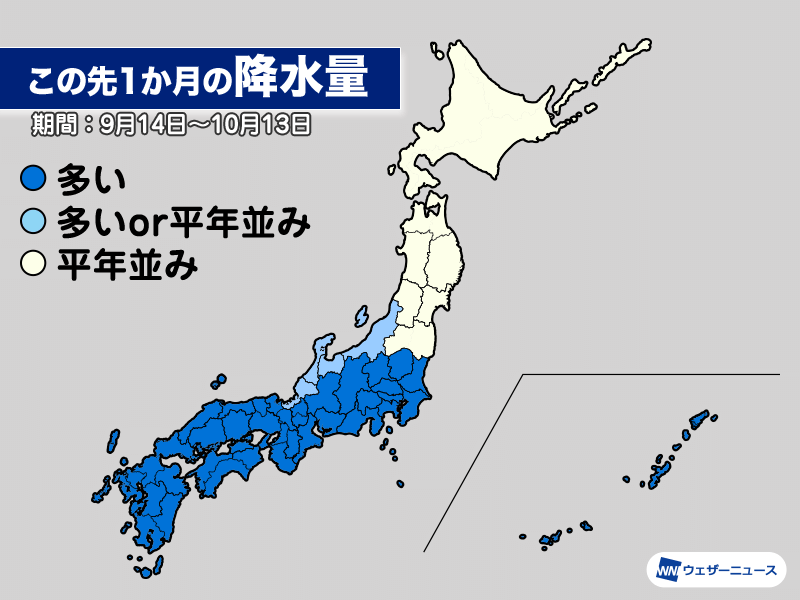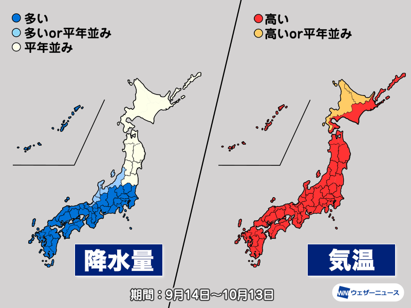 太平洋高気圧が強い勢力になる一方で、中国大陸の華北付近でも高気圧が強まり、その間に秋雨前線が形成されます。暖かく湿った空気が流れ込むことで秋雨前線が活発になる見通しで、1か月の降水量は西日本、東海、関東甲信で平年より多く、北陸では平年並みか平年より多い予想です。