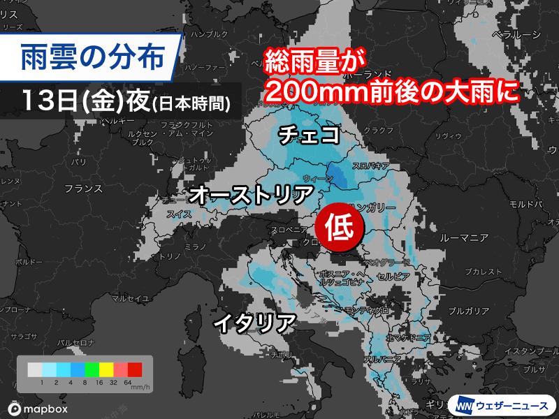 特にオーストリアやハンガリー、チェコなどで14日(土)にかけて断続的に強雨となり、雨量が増加するおそれがあります。多い所では総雨量が200mm前後に達する見通しです。