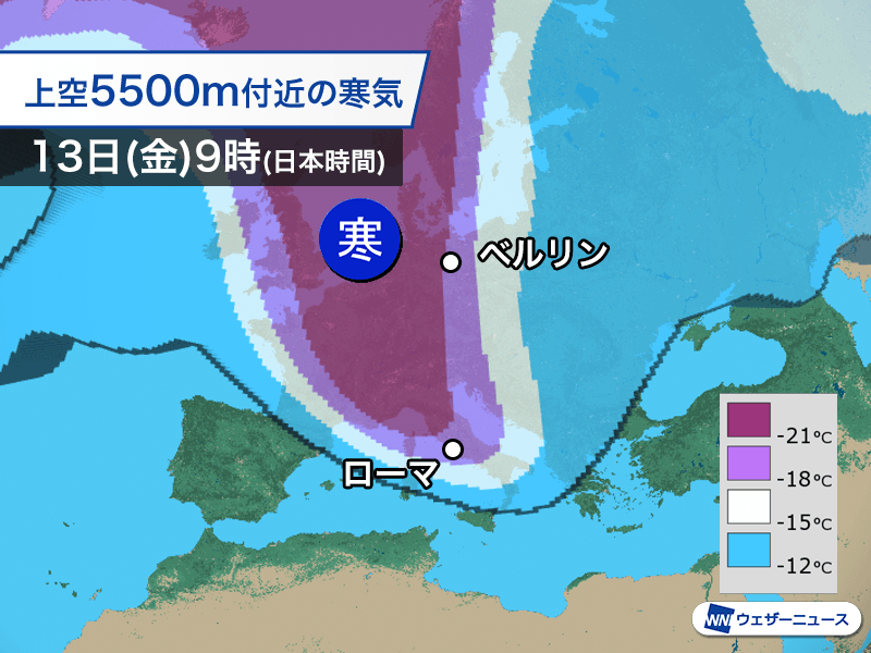 上空5500m付近で−21℃以下の、この時期としては強い寒気が北海方面から地中海付近まで大きく南下しています。寒気の南下によって気温が大きく低下し、ドイツやスイスといった内陸の地域では冷え込みが強まりました。