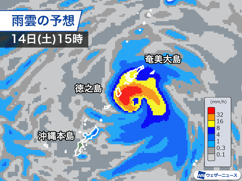 台風13号は中心に近い所に活発な雨雲を伴っていますので、進路に当たる奄美大島や徳之島などは昼過ぎから夕方にかけて雨のピークになります。台風の速度が速いため、強雨の時間はそれほど長くはないものの、ピーク時には1時間に80mm以上の猛烈な雨の降るおそれがあります。