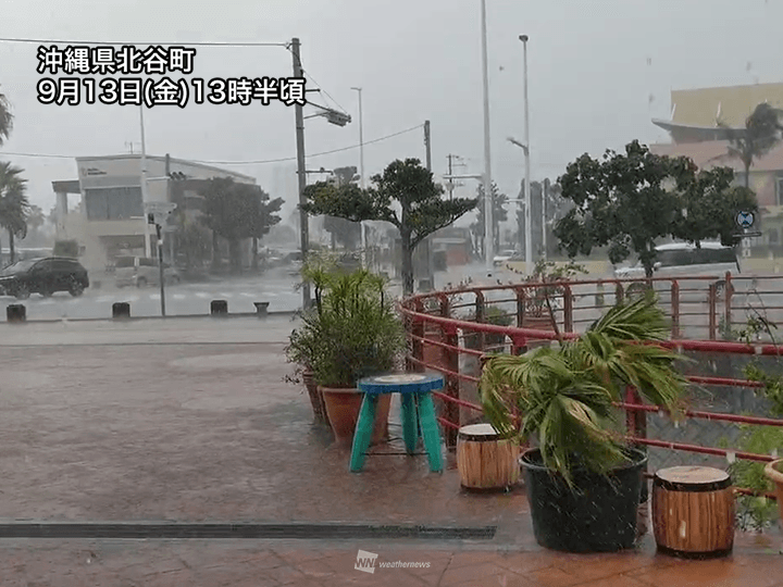 一つ一つの雨雲はそれほど大きくはないため、強雨の継続時間は短いものの、雨雲の下では雷を伴った土砂降りの雨です。13時30分までの1時間には沖縄県那覇空港(安次嶺)で30.0mmの激しい雨を観測しました。