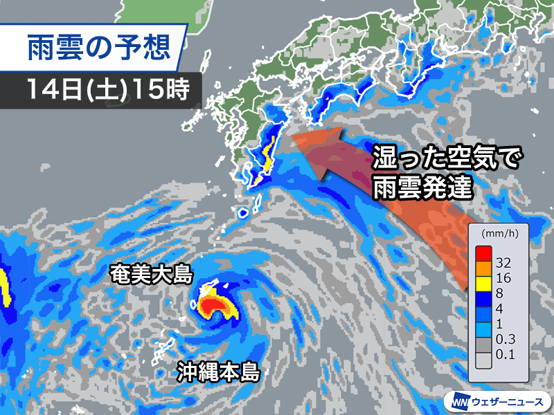 また、台風の影響で湿った空気が流れ込むため、西日本の太平洋側は断続的に雨が降る見込みです。特に地形の影響を受けやすい宮崎県や高知県などは雨雲が発達して激しい雨の降るおそれがありますので、油断はできません。台風が東シナ海に進んだ後も湿った空気の流入が続くため、15日(日)にかけて強まる雨に注意が必要です。
