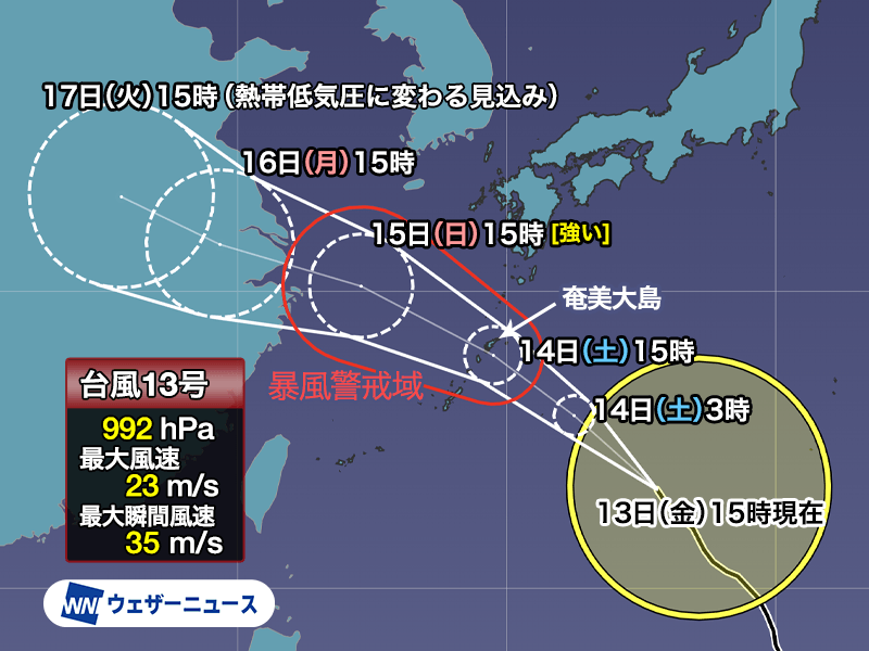 台風13号は三連休初日となる明日14日(土)に奄美大島付近を通過し、東シナ海に進む予想です。