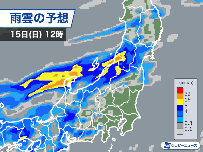 東北や北陸は朝から雨の降る所が多く、特に東北南部日本海側や北陸は雷を伴った激しい雨のおそれがあります。局地的には1時間に50mm以上の非常に激しい雨になるため、道路冠水や河川の急な増水などに注意が必要です。