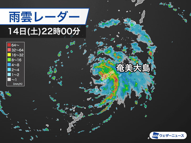 また、台風は中心付近に活発な雨雲を伴っています。14日(土)22時30分までに、鹿児島県名瀬では1時間降水量45.0mmを観測しています。強雨の時間はそれほど長くないものの、最接近時は1時間に50mm以上の非常に激しい雨の降るおそれがあるため、道路冠水や低地の浸水などに警戒が必要です。