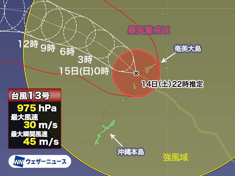 台風13号は、暴風域を伴って奄美大島付近を通過しています。