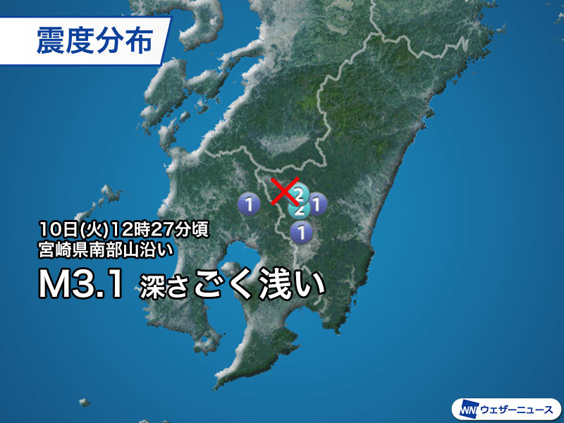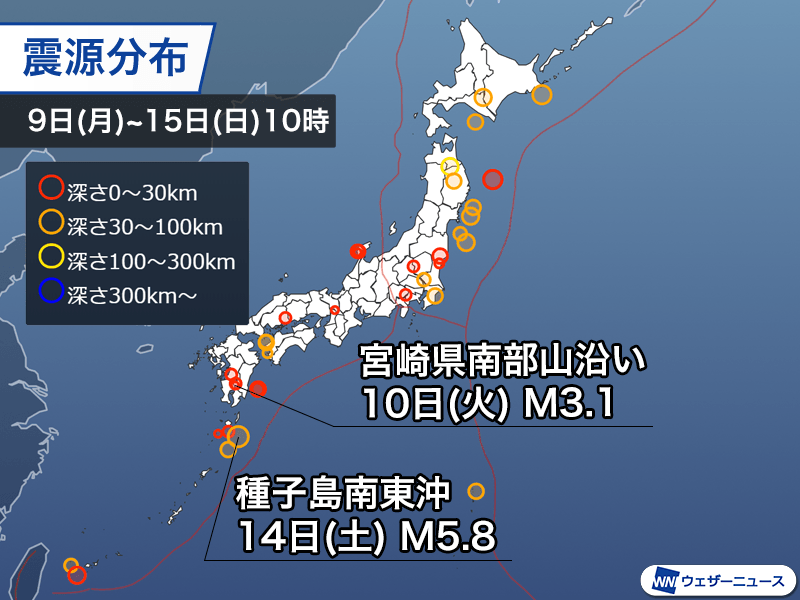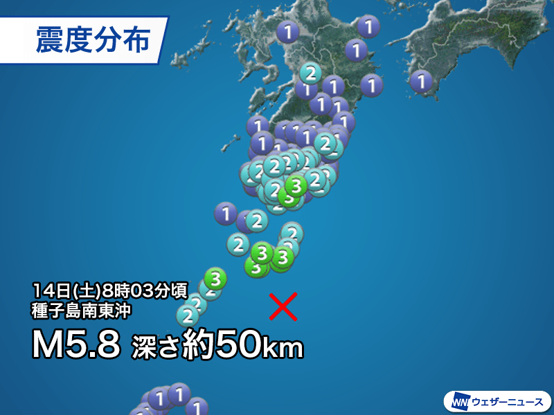 14日(土)8時03分頃、種子島南東沖を震源とするマグニチュード5.8、深さが約50kmと推定される地震が発生しました。この地震で鹿児島県錦江町、肝付町、南種子町、屋久島町、十島村で最大震度3、鹿児島県や宮崎県を中心に震度2の揺れを観測しました。