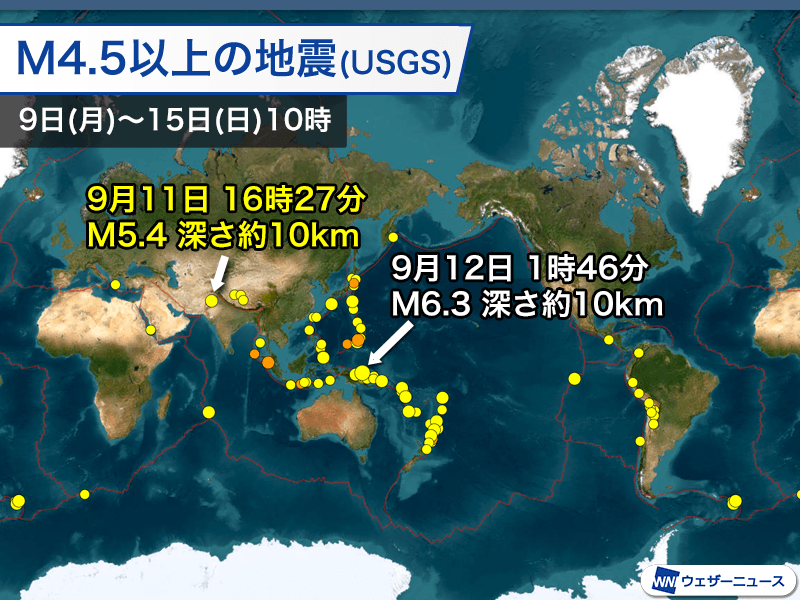 アメリカ地質調査所の解析によるマグニチュード6以上の地震は1回発生しました。最も大きな地震はパプアニューギニア付近で発生したマグニチュード6.3です。