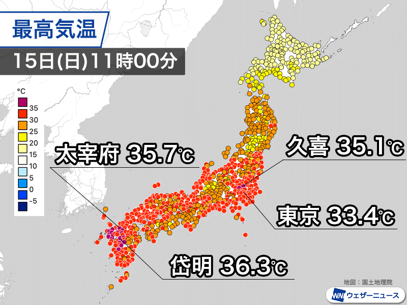 11時00分までの最高気温は全国で最も高い熊本県玉名市・岱明で36.3℃、長崎県西海市で35.8℃などすでに21地点が猛暑日です。関東も気温が高く、埼玉県久喜市で35℃を上回っています。また、福岡県太宰府市でも35.7℃を観測。11日連続で今年57日目の猛暑日です。今日も年間最多の日本記録を更新しました。