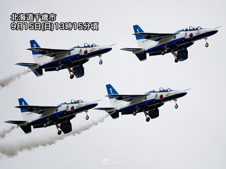 北海道千歳市の上空をブルーインパルスが飛行 千歳のまちの航空祭