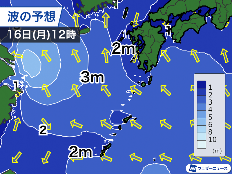 沖縄本島や奄美地方、種子島・屋久島などは2〜3mの波が予想され、うねりを伴います。釣りなど海のレジャーは危険ですので、天気が回復して晴れ間が見えていても、避けるようにしてください。