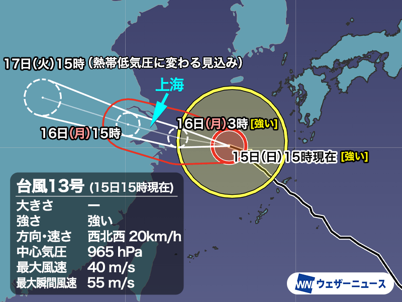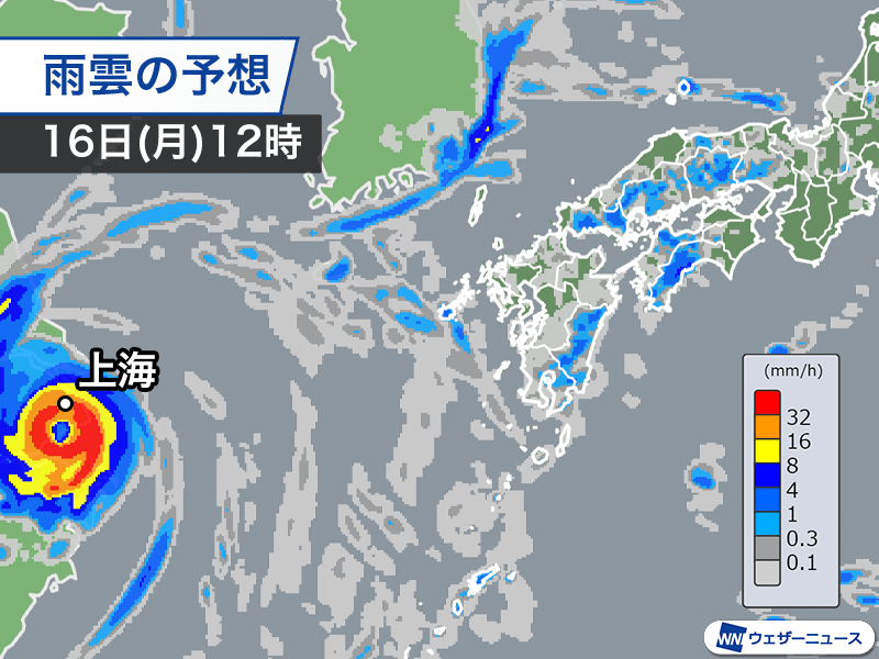 台風本体の雨雲は明日の朝から中国大陸の東シナ海沿岸にかかり始め、上海でも昼過ぎにかけて猛烈な雨の降るおそれがあります。台風が強い勢力のまま直撃することから暴風雨になるとみられ、影響が懸念されます。