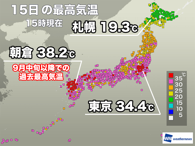 15時00分までの最高気温は福岡県朝倉市で38.2℃と、9月として観測史上1位を記録しています。9月中旬以降に38℃以上を観測するのは国内で初めてです。そのほか、福岡市で37.4℃、長崎県佐世保市で37.5℃、熊本市で37.0℃など九州を中心に30地点近くで9月の最高気温を更新しました。(タイ記録含む)