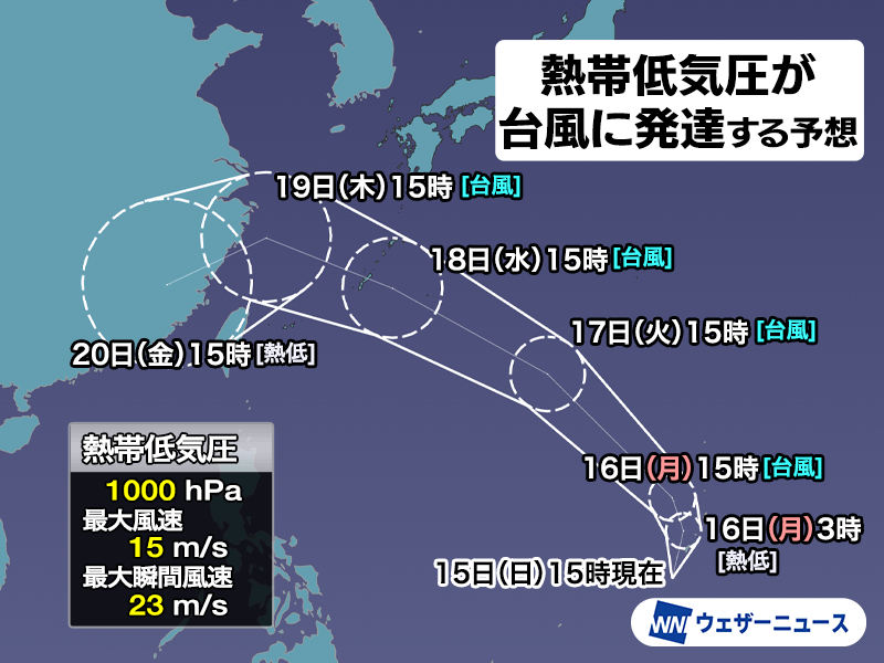 熱帯低気圧はゆっくりと北上しながら台風へと発達し、その後は西寄りに進路を変えて、北西に進むとみられます。