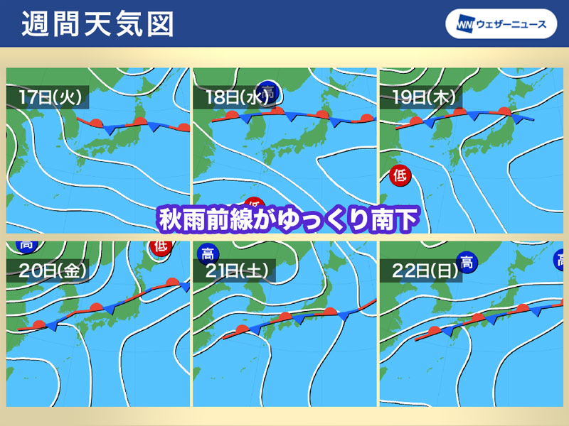 秋雨前線が東日本〜山陰沖に停滞しています。19日(木)頃にかけてゆっくりと北上し、東北〜日本海付近に停滞する見込みです。東北や北陸などで雨の降る所がありそうです。