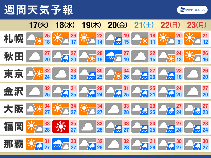 今週は秋雨前線の南側のエリアではまだ厳しい残暑が続きますが、次の週末には雨と共にようやく暑さが和らぎます。
